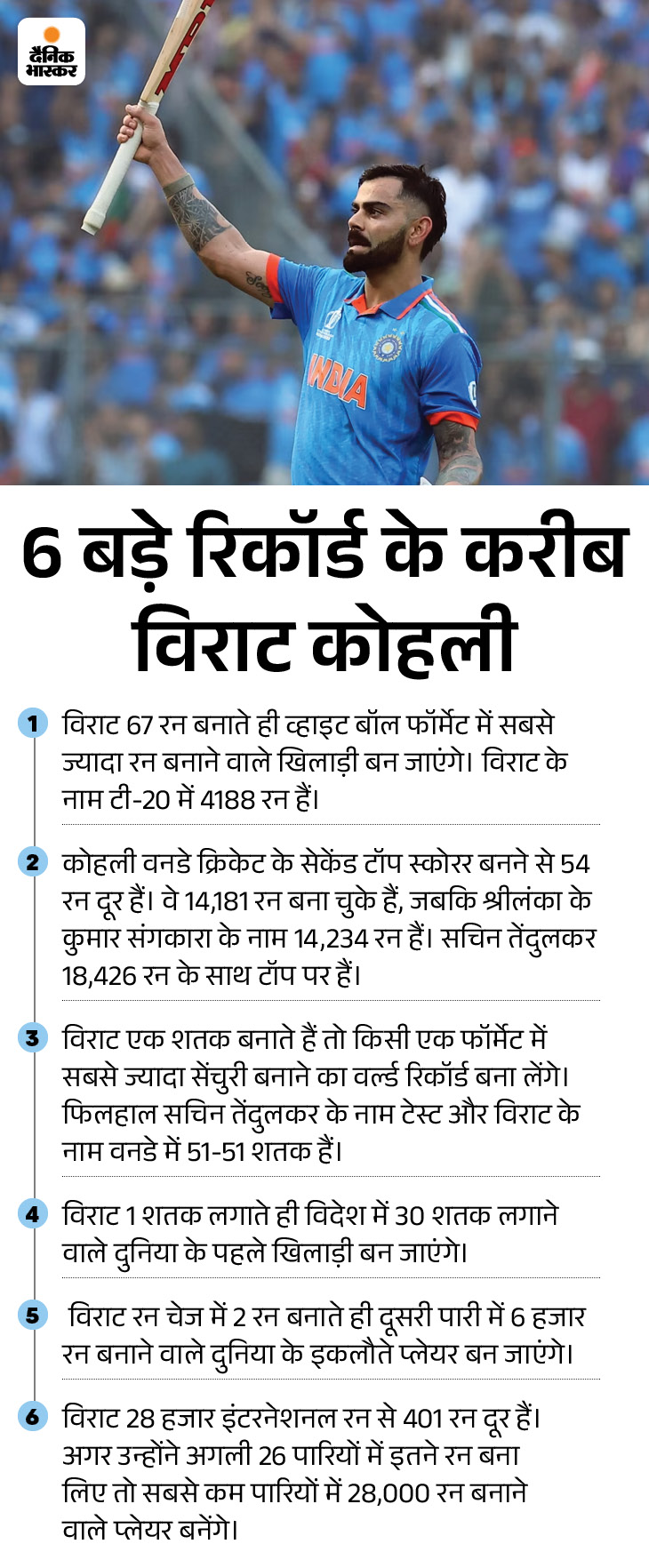 विराट कोहली आज शतक बनाते हैं तो किसी एक फॉर्मेट में सबसे ज्यादा सेंचुरी बनाने का वर्ल्ड रिकॉर्ड बना लेंगे। फिलहाल सचिन तेंदुलकर के नाम टेस्ट और विराट के नाम वनडे में 51-51 शतक हैं। कोहली 54 रन और बनाते ही वनडे इतिहास के दूसरे टॉप स्कोरर भी बन जाएंगे। वे श्रीलंका के कुमार संगकारा को पीछे छोड़ेंगे।