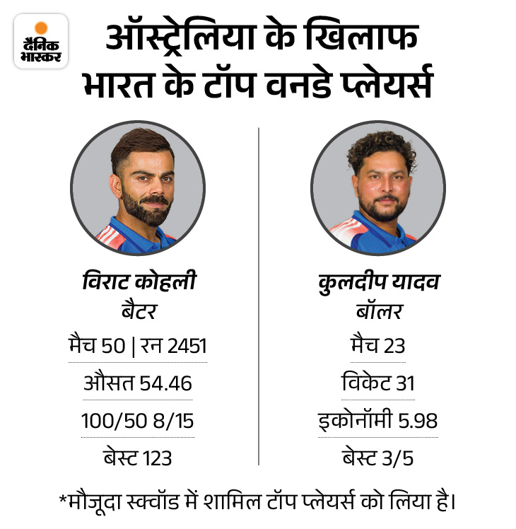 कोहली ऑस्ट्रेलिया के खिलाफ टॉप स्कोरर ऑस्ट्रेलिया के खिलाफ भारत के मौजूदा स्क्वॉड में विराट कोहली ने सबसे ज्यादा रन बनाए हैं। उनके नाम 8 शतक और 15 फिफ्टी भी हैं। वे एक और 50+ स्कोर बनाते ही सचिन के ऑस्ट्रेलिया के खिलाफ वनडे में सबसे ज्यादा 24 फिफ्टी प्लस स्कोर के रिकॉर्ड की बराबरी कर लेंगे। कुलदीप यादव ने कंगारुओं के खिलाफ सबसे ज्यादा विकेट लिए हैं।