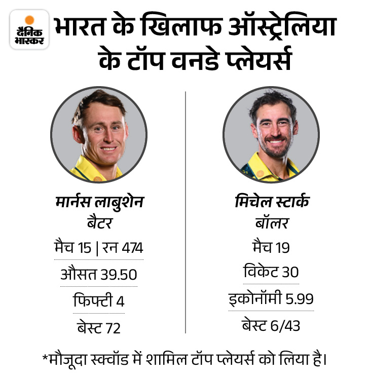 स्टार्क भारत के खिलाफ टॉप विकेट टेकर भारत के खिलाफ ऑस्ट्रेलिया के तेज गेंदबाज मिचेल स्टार्क ने मौजूदा स्क्वॉड में सबसे ज्यादा विकेट लिए। मुकाबले में उन्हें जोश हेजलवुड का भी साथ मिलेगा। हालांकि, बैटिंग में स्क्वॉड का कोई बल्लेबाज 500 रन भी नहीं बना सका। कप्तान मिचेल मार्श और मार्नस लाबुशेन इस रिकॉर्ड के करीब हैं।