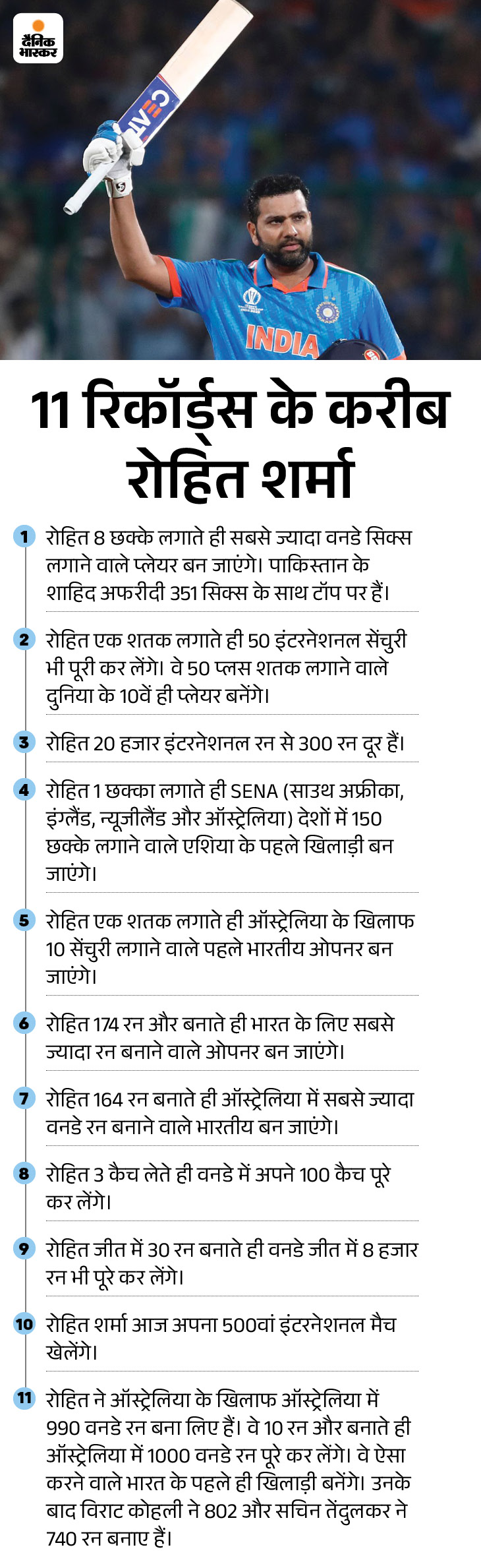 - ऑस्ट्रेलिया के खिलाफ वनडे में सबसे ज्यादा 9 शतक तेंदुलकर ने लगाए हैं। रोहित और कोहली 8-8 सेंचुरी लगाकर संयुक्त रूप से दूसरे नंबर पर हैं। दोनों में से कोई भी प्लेयर सीरीज में 2 सेंचुरी लगाकर इस रिकॉर्ड को अपने नाम कर सकता है।