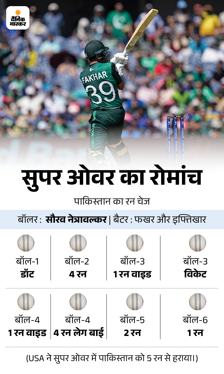 20-20 ओवर के खेल के बाद मुकाबला टाई रहने के बाद USA ने सुपर ओवर में पहले बैटिंग की और 18 रन बनाए। इसके बाद अमेरिका के कप्तान मोनांक पटेल ने सौरभ को गेंद थमा दी। उनके सामने आए फखर जमान और इफ्तिखार अहमद। दोनों ही क्रिकेट में बड़े-बड़े शॉट्स लगाने के लिए पहचाने जाते हैं। सौरभ ने यहां वाइड यॉर्कर की लाइन पकड़ कर रखी और 6 गेंद पर 13 ही रन देकर पाकिस्तान को मैच जीतने से रोक लिया।